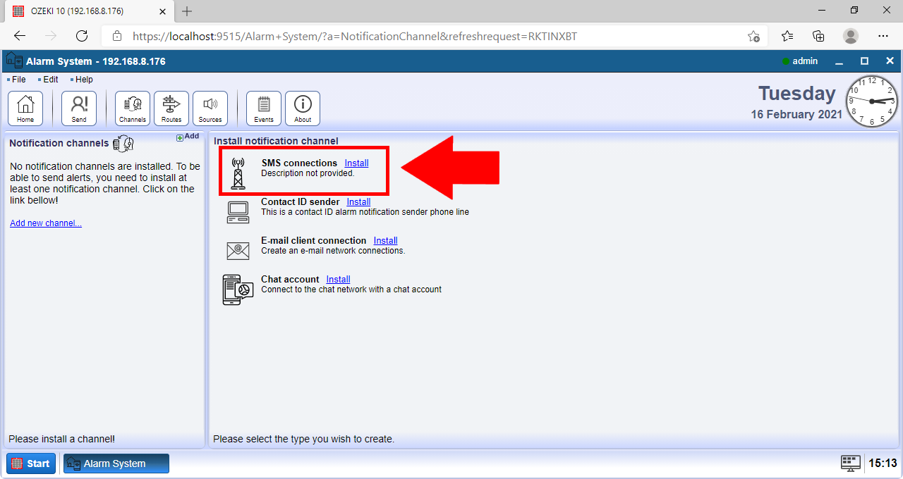 Now you need to choose which type of notification channel you wish to install. You can see all your options on Figure 3. The SMS connections can handle your data transfer between applications and mobile network. Click the Install button located next to the SMS connections title.