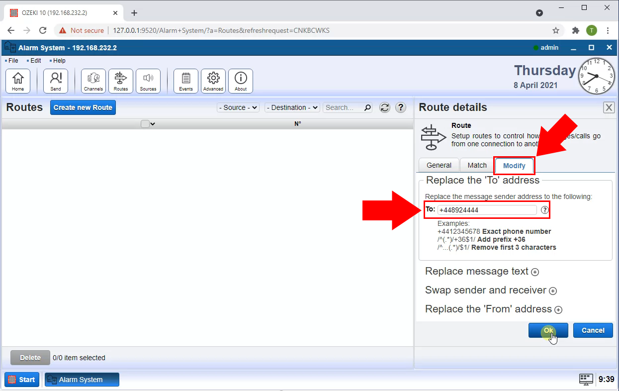 Now you need to create a route that can be used to send the SMS in case of an error. To do so, click the Routes button located on the Toolbar next to the Sources button. Now you will see a Route details panel on the right side of the screen. In the From textbox, you will need the address of the alarm source. In the To section, you will need the address where you wish to send the notification message (Figure 8). Click the Ok button after you have finished the setup.