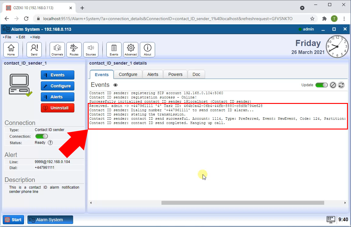 Finally you can see on the Contact ID sender's Events tab that the Contact ID alert is sent.