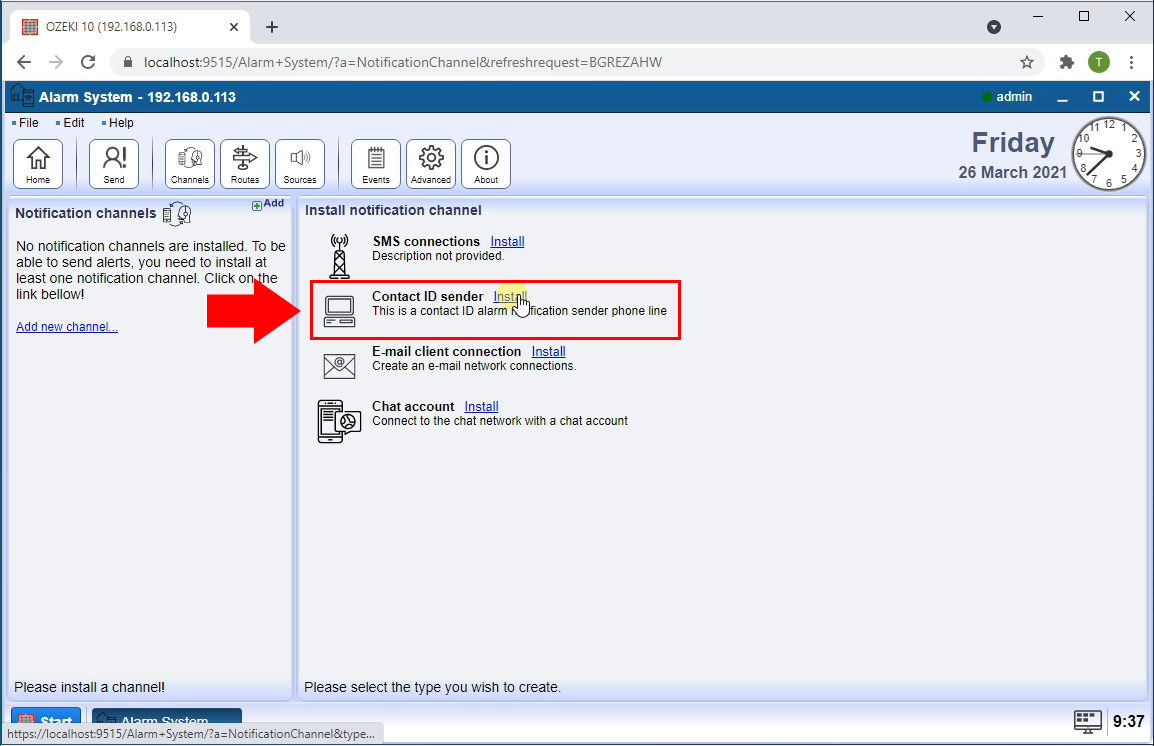 Now you need to choose which type of notification channel you wish to install. You can see all your options on Figure 3. The Contact ID sender can dial the configured phone number and play the previously defined Contact ID alert. Click the Install button located next to the Contact ID sender title.