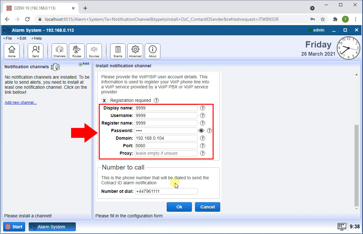 The first step is to launch the Alarm System application. You can do this by clicking the icon of it on your desktop or search for it in the Ozeki OS. Zhen, you need to add a new notification channel, which will notify you in case of a predetermined event. To add the new channel, click the Add new channel… button located on the left side of the screen. You can see where to click on Figure 2.